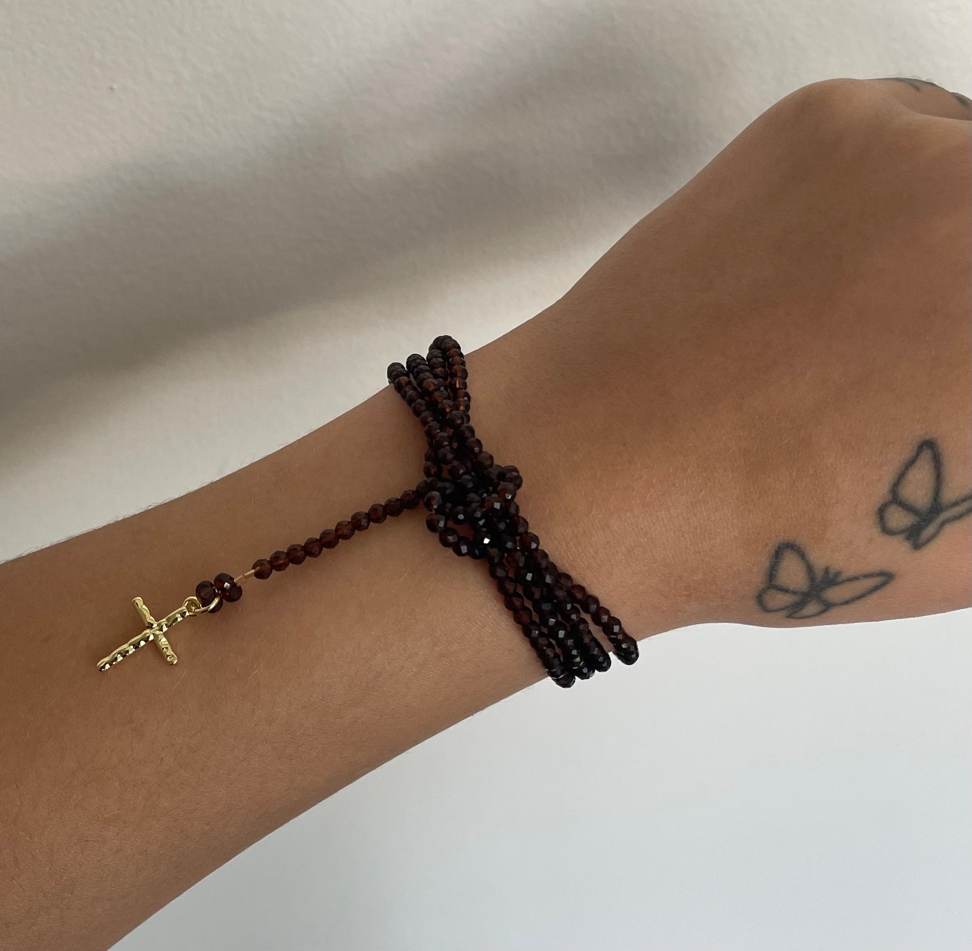 The "Lumière" necklace is a multifunctional piece that consists of dark brown beads with gold plated hardware